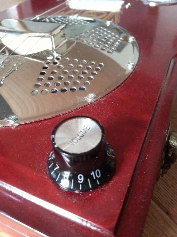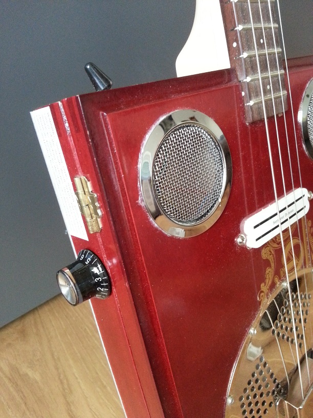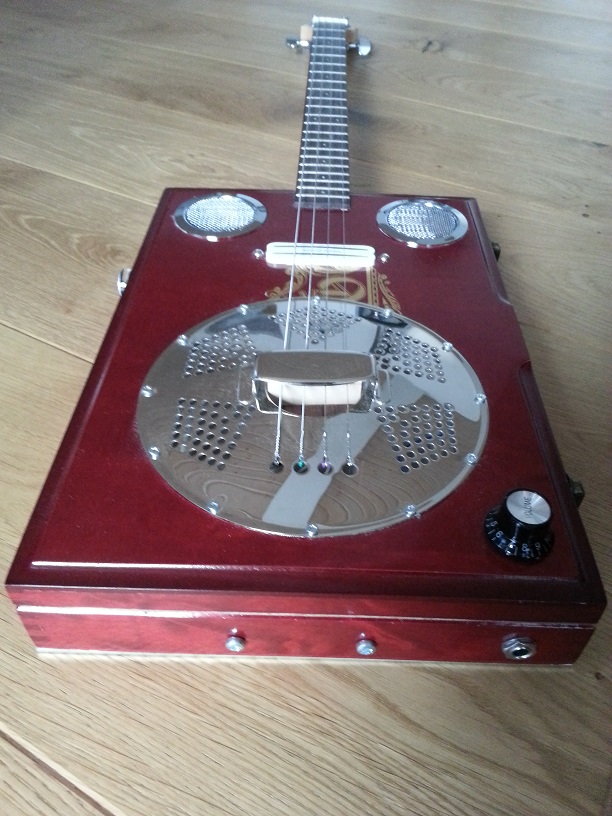Die Dobro Cigarbox Guitar ist etwas vom edelsten was CigarBox Guitars zu bieten hat. Unter der Dobro Abdeckung ist der Coin verborgen. Mit einem Piezo Schallwellenabnehmer kommt der Dobro Sound so richtig zur Geltung